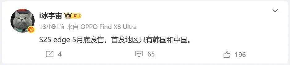 据博主 @i冰宇宙 爆料,三星 Galaxy S25 Edge 会在 5 月底发售,最初仅在韩国和中国上市。