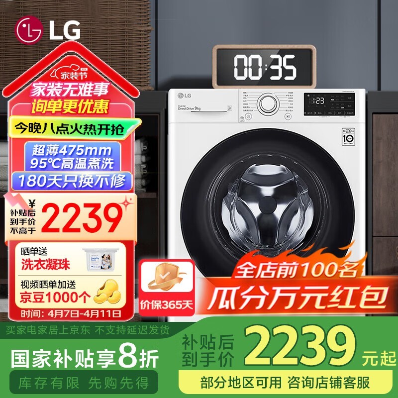 LG纤薄系列FCY90N2W直驱滚筒洗衣机2129元好价