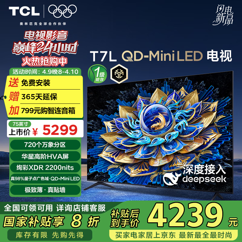 TCL T7L 75英寸电视京东优惠,到手4102元