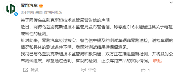 我司已与乌兹别克斯坦技术监管局积极沟通,双方正在推进重新检测,并将及时公布测试进展,希望通过透明、客观的检测,还原零跑产品的实际情况。