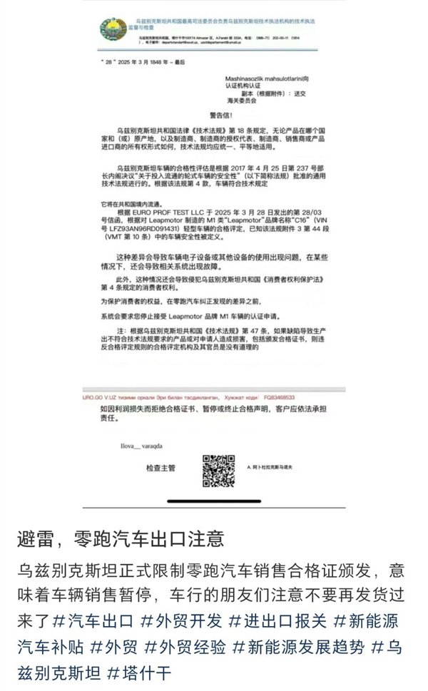 近日,网传乌兹别克斯坦技术监管局发布警告信,称零跑C16未能通过其关于电磁兼容性的检测。