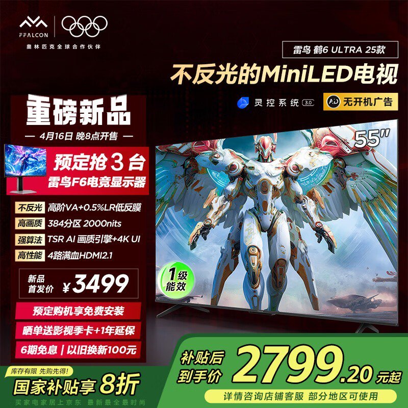 雷鸟鹤6 Ultra 55英寸平板电视优惠价2799元