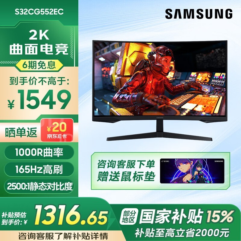 三星S32CG552EC电竞显示器2K/165Hz仅1316元