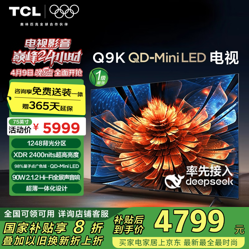 TCL75Q9K电视4K超高清大屏智能京东活动价3660元到手