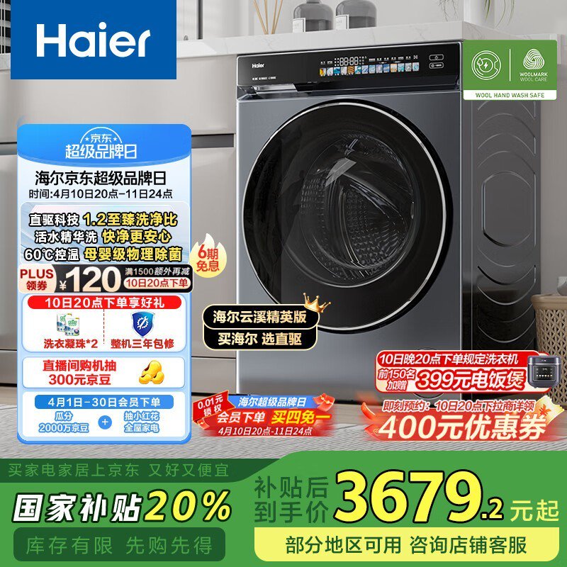 海尔云溪精英版583系列滚筒洗衣机限时优惠仅3167元