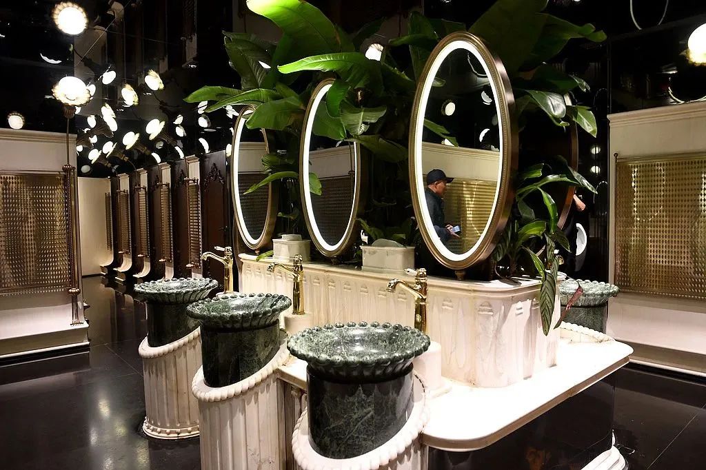 盥洗台上放着的摆花,装在法国设计师品牌Maison Dada打造的Narcisse花瓶里。道路两旁的花瓣灯,是特别开模定制的,“每朵都是德基特有的臻品”;走进厕所,等候区、母婴室、医疗室、无障碍卫生间一应俱全,随处可见的,是融合了室内高尔夫元素的装置,进口的尿布台,就连洗手池的高度都是经过“人体工学研究”后调到的最佳位置。