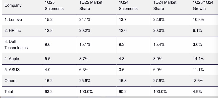 根据IDC最新数据,2025 年第一季度个人电脑出货量较上年同期增长 4.9%,全球出货量达到 6320 万台,高于 IDC在 2 月份预测的 6240 万台(同比增长 3.7%)。