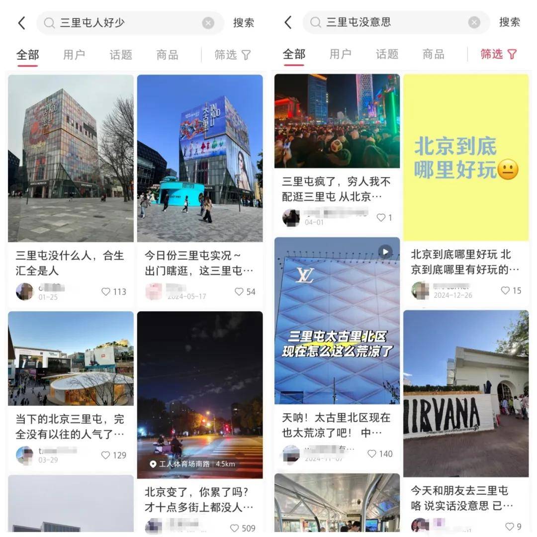 在小红书,搜索有关三里屯最近的笔记,很容易就翻到了2024年,可见相关笔记数量之少。而在这些时间较近的笔记中,“三里屯没意思”和“三里屯人好少”的相关内容也比比皆是。