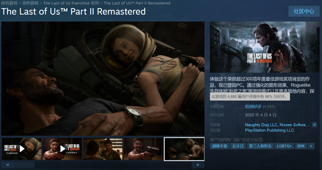 4月4日清明节这一天,先前一直由PS主机独占的《最后生还者 第二部 复刻版》(以下简称TLOU2Re)登上了PC平台。