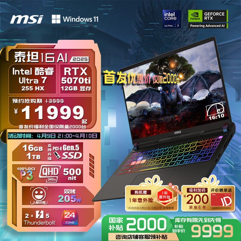 微星泰坦16 AI游戏本,京东优惠价9739元