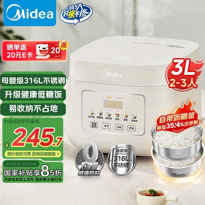 美的电饭煲MB-3E91LS健康无涂层低糖电饭煲京东促销到手价168元