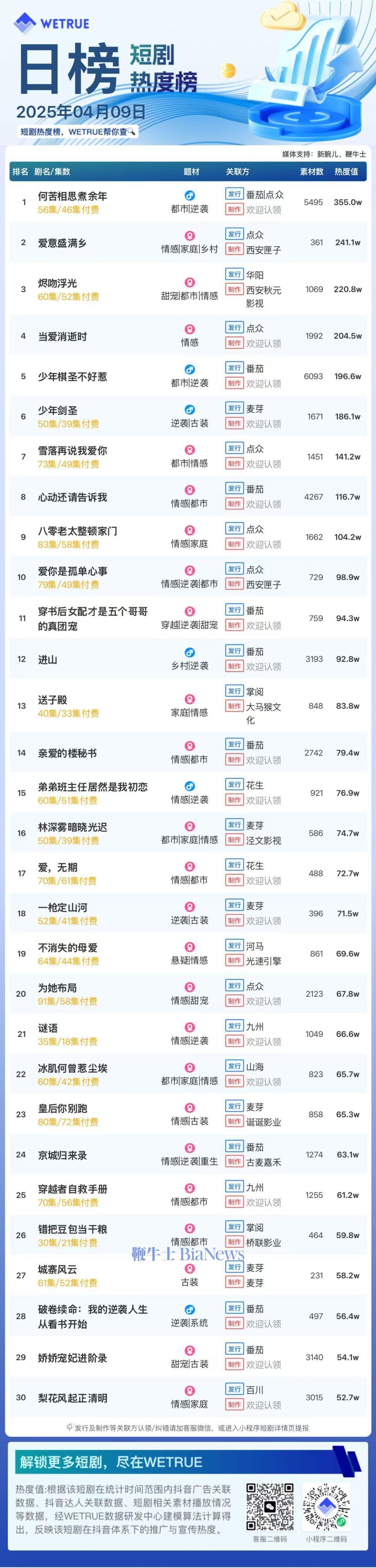 1、本日榜为WETRUE短剧数据公司提供,新腕儿和鞭牛士提供联合支持。