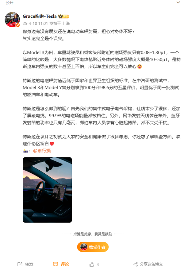 快科技4月10日消息,今日,特斯拉副总裁陶琳微博发文,谈到了“电动车辐射高,担心对身体不好”的言论,她指出,这完全是个误会。