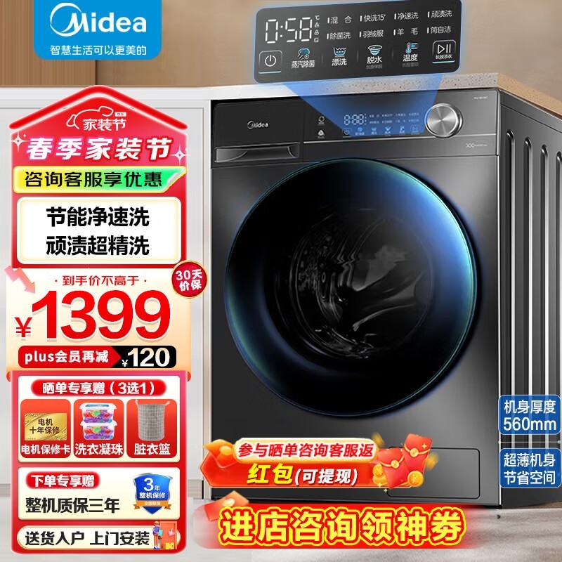 美的10公斤滚筒洗衣机,优惠后价1015元
