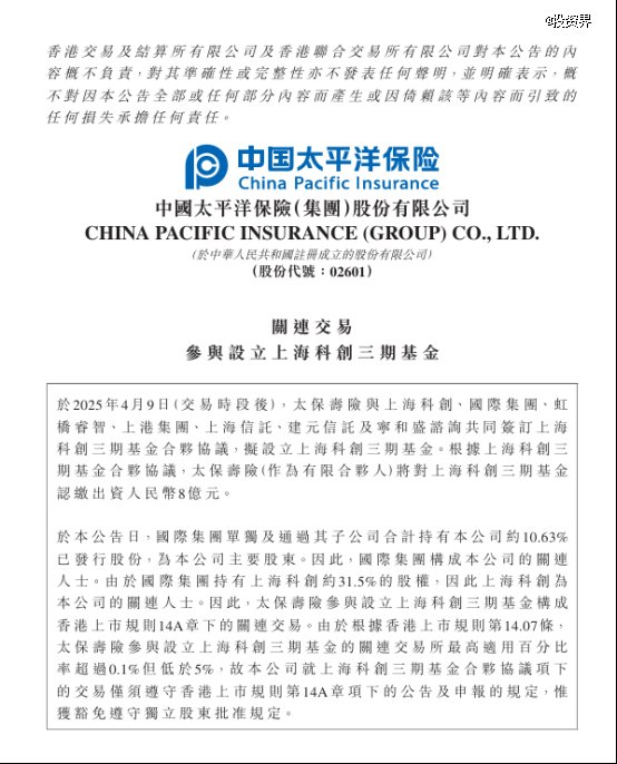 公告显示,太保寿险参与上海科创三期基金的设立是贯彻落实国家创新驱动发展战略、推动实现上海科创中心建设战略目标的重要举措。公司通过参与设立上海科创三期基金,与上海科创三期基金参与方将进一步强化战略协同和业务链接,共同服务上海科创中心和国际航运中心建设。