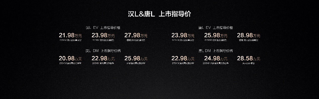 4月9日,比亚迪划时代旗舰SUV唐L正式上市,共推出唐L DM、唐L EV两大车系。新车长宽高分别为5040*1996*1760mm,轴距2950mm,是标准的C+级SUV。其中,唐L DM坐拥215KM激光雷达旗舰型、200KM四驱激光雷达旗舰型、无人机玩家版;唐L EV坐拥670KM激光雷达尊享型、670KM激光雷达旗舰型、四驱激光雷达旗舰型。新车提供4种外观颜色及2种内饰配色,售价为22.98万~28.98万元。