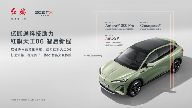 和一汽红旗的合作,更像是对亿咖通综合能力的一次“大考”。今年2月,一汽红旗天工系列天工05正式上市,该车型同时搭载了安托拉1000 Pro计算平台与Cloudpeak云山跨域软件平台,获得了不少用户好评。不仅如此,亿咖通以大语言模型为基础集成Deepseek打造的车载AI大模型ECARX AutoGPT,也将规划于该车型上落地应用,该套方案近期又搭载在天工06中正式开启预售,组成天工“双子星”,亿咖通的系统能力成为红旗智能化表现跃升的关键。