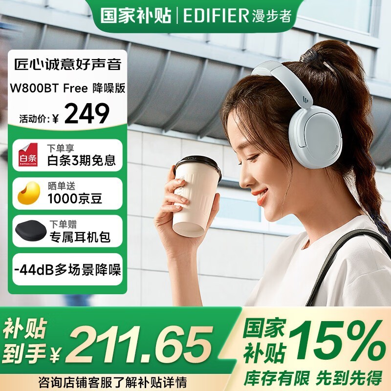 漫步者W800BT Free降噪版头戴式蓝牙耳机仅249元