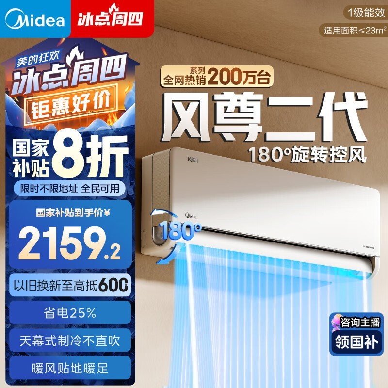 美的风尊二代壁挂式空调1匹新一级能效享多重补贴低至1742元