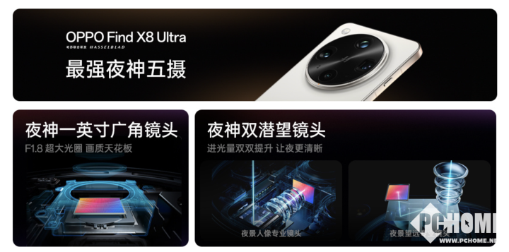 参数方面,OPPO Find X8 Ultra后置搭载五摄超光感计算光学系统,分别为5000万像素1英寸索尼LYT900主摄、5000万像素的LYT600 6倍潜望超长焦镜头、5000万像素的索尼LYT700 3倍潜望长焦微距镜头、5000万像素的JN5超广角镜头、丹霞原彩镜头。成像方面,Find X8 Ultra的丹霞原彩镜头行业首创分区色温感知技术,可通过分区色温感知技术,保证夜间复杂光线场景人物肤色不偏移。