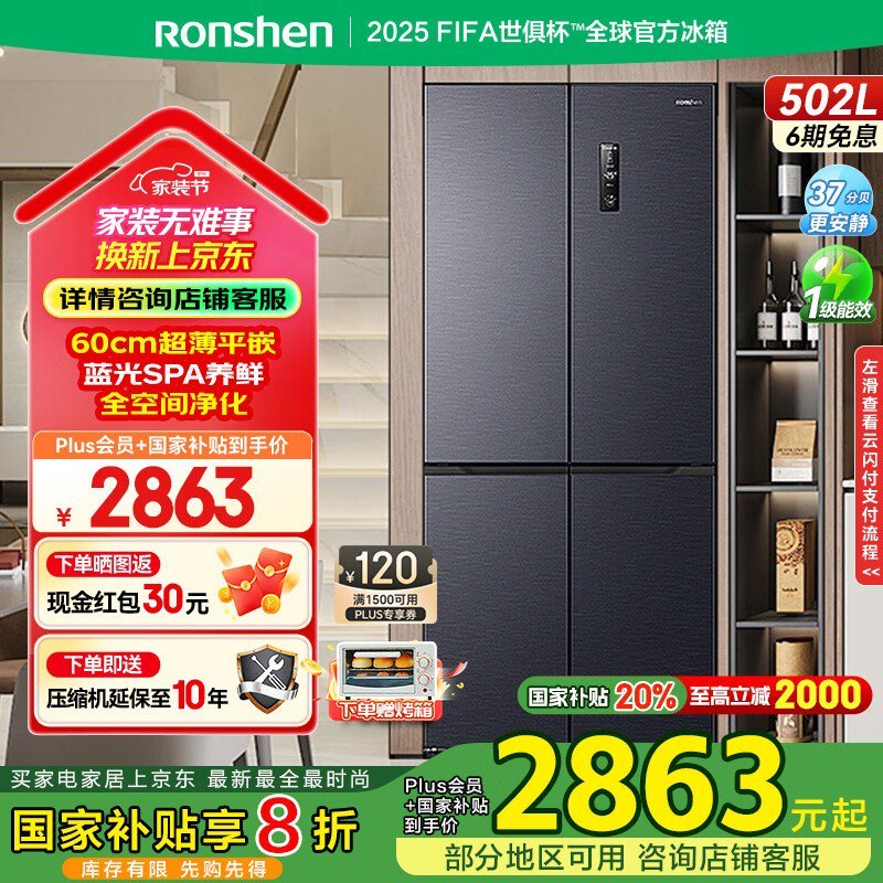 容声十字对开门冰箱502L超薄零嵌星空灰京东特惠2441元