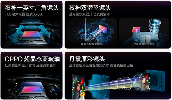 Find X8 Ultra 的 70mm 夜景人像专业镜头采用 F2.1 超大光圈,进光量提升至 150%,可大幅提升夜景人像的清晰度和纯净度;搭配首个超晶态蓝玻璃(红外截止效率提升 81%),解决夜景偏色难题,还原真实肤色。135mm 夜景人像望远镜头是当下手机中原生光学焦段最远的镜头,采用全新的 F3.1 超长焦大光圈设计和 OPPO 独有的倒置潜望结构,进光量大幅提升至 251%,无论白天夜晚,都可以将远方画面的细节清晰记录。23mm 的一英寸广角镜头,无惧明暗光影,各种场景全面驾驭,还支持额外的 28mm、35mm、47mm 三个高品质焦段的随心切换。全新 5000 万像素超广角摄像头,采用 F2.0 超大光圈,更提供超广视野,带来更具震撼力的构图选项。