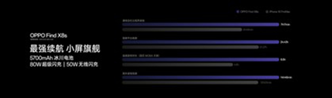 OPPO Find X8s 在小尺寸机身中集成了更大的 5700mAh超大冰川电池,同时支持80W超级闪充和50W无线闪充,无论是拍视频、追剧、玩游戏、还是刷抖音,甚至能超越传统大屏旗舰手机的续航表现。Find X8s 最多支持6.5小时的连续《王者荣耀》游戏,比传统大屏旗舰还要长接近2个小时。