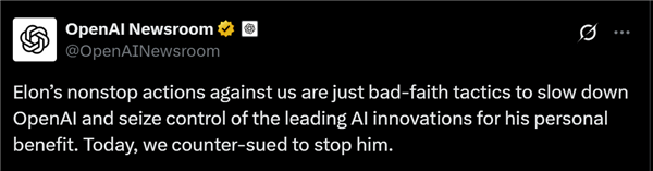 OpenAI表示,马斯克对OpenAI无休止的行动是为了他的个人利益,企图控制领先的AI创新,其一直在散布虚假信息,实际上OpenAI正准备建立世界上装备最好的非营利组织。