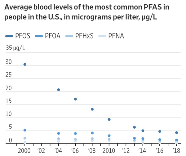 根据美国疾病预防控制中心的说法,所有美国人身上都有不同程度的PFAS,随着21世纪一些公司开始规避使用这种物质,他们发现血液中这种物质的含量也随之下降。