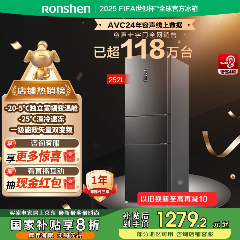 容声252L风冷三门冰箱,墨韵灰设计,到手仅1271元