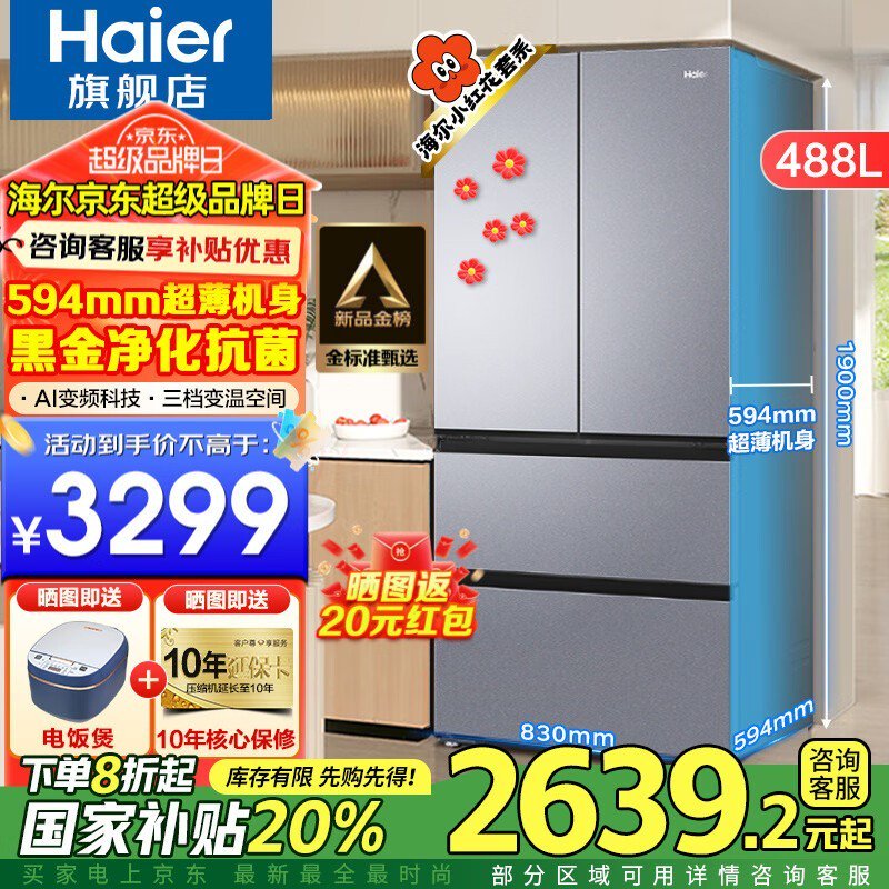 海尔488升超薄大容量电冰箱,法式精储,黑金净化,低至2569元