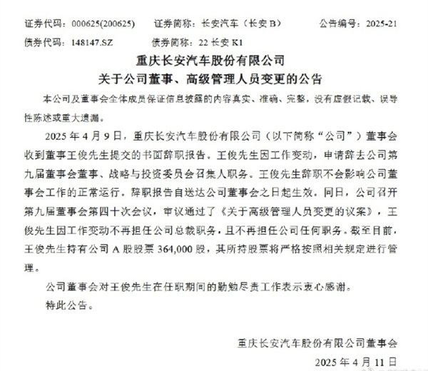 同日,长安汽车召开第九届董事会第四十次会议,审议通过了《关于高级管理人员变更的议案》,王俊因工作变动不再担任公司总裁职务,且不再担任公司任何职务。