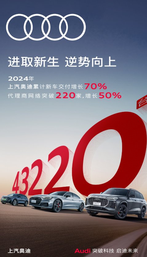 过去的2024年,尽管各大车企面临价格战、出海潮等诸多挑战,但是上汽奥迪依然保持了强劲的增长势头,这一点从它公布的销售数据中就能窥得一二。2024年,上汽奥迪全年累计销量达43,220辆,并实现了新车交付70%的增长。尤其是在汽车行业整体增速变缓的背景下,这一成绩的含金量更显可贵。细究销量增长背后,上汽奥迪到底做对了什么?不妨跟着本文一起往下看。
