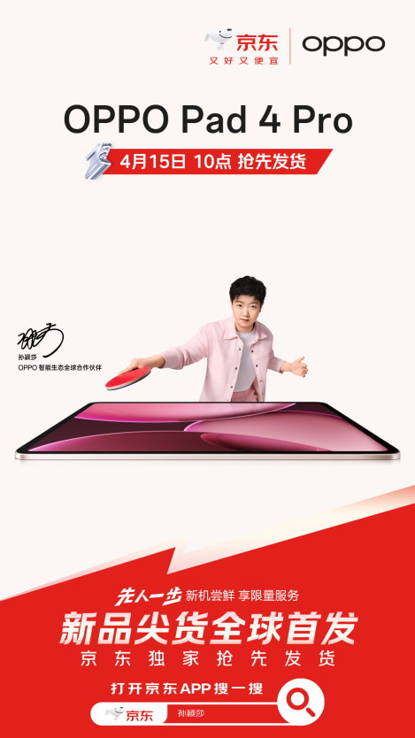 4月10日,OPPO在Find X8系列暨移动智能生态新品发布会中发布了OPPO Pad 4 Pro,这款由奥运冠军孙颖莎代言的平板新品,一经发布便引发广泛关注。为满足消费者换新需求,京东先人一步上线了该系列平板,并将在4月15日全网抢先现货发售,售价3299元起,在京东下单的消费者可享国家补贴,到手价低至2804元,叠加20%的以旧换新补贴到手价更低至6折,还有3期免息、购平板套装至高优惠200元、晒单最高可得80元京豆等实在福利,并可获赠价值399元的OPPO Pencil 2原装手写笔和OPPO Pad 4 Pro孙颖莎限定周边礼盒,PLUS会员还可享180天只换不修服务,先到先得。值得一提的是,除上述福利外,下单OPPO Pad 4 Pro的消费者还可享京东独家赠B站大会员的实在权益,打算换新的消费者现在就来京东搜索“孙颖莎”,详细了解吧!