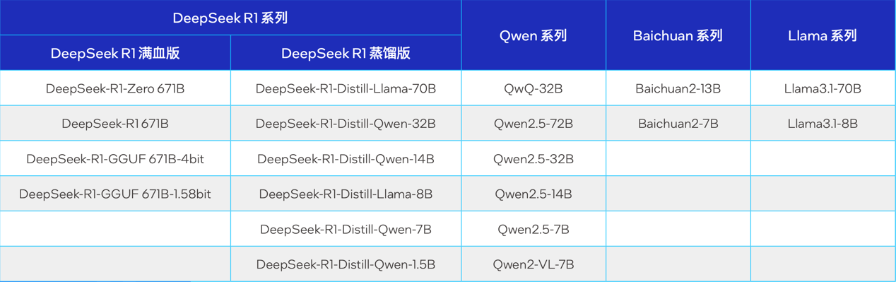 像这样的配置,不光能够很好地支持DeepSeek R1系列,同时还与Qwen、Baichuan、Llama等多个开源模型兼容适配。
