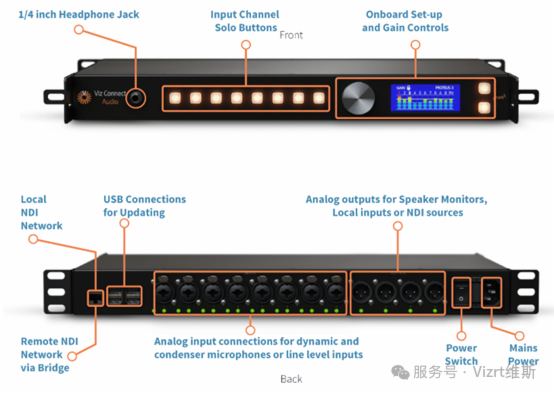 Viz Connect Audio涵盖了所有连接功能,通过1/4英寸XLR线路或话筒输入组合以及NDI连接提供8路模拟输入。不仅如此,还有耳机连接和多达4路XLR模拟输出。通过集成的NDI Bridge,Viz Connect Audio可提供从隔壁服务器机房到全球各地TriCaster的无限连接。