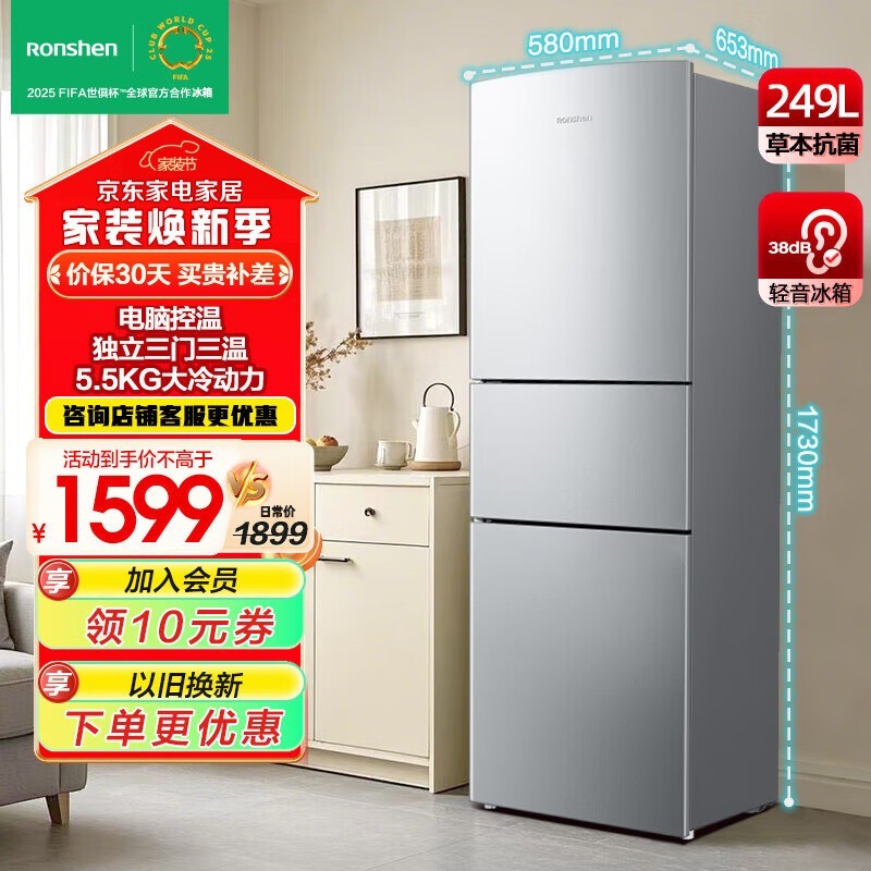 容声BCD-249WD1N三门冰箱249升大容量静音节能