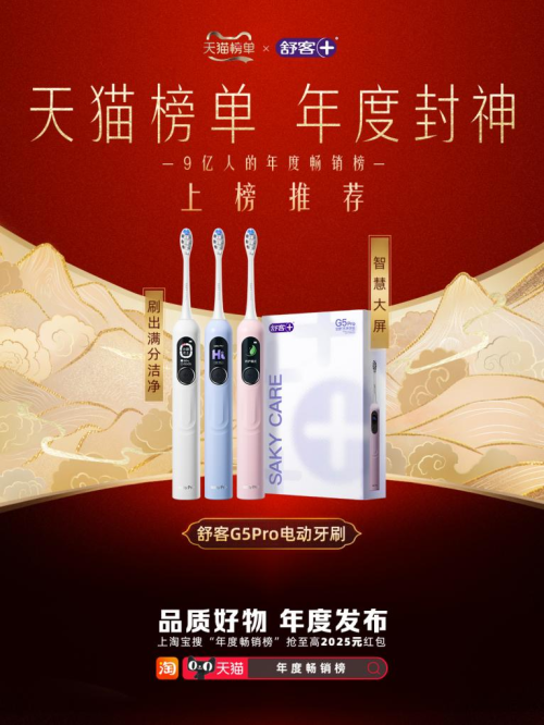 近日,天猫榜单年度畅销榜正式揭晓,舒客G5 Pro电动牙刷凭借卓越的市场表现与消费者的高度认可成功上榜。作为电商领域最具权威性的榜单之一,天猫榜单基于淘宝天猫平台9亿消费者的真实消费数据,覆盖家电、数码、美妆、母婴等多个热门品类。舒客G5 Pro电动牙刷的入选,不仅印证了其出色的产品力,也进一步巩固了舒客品牌在口腔护理领域的领先地位。