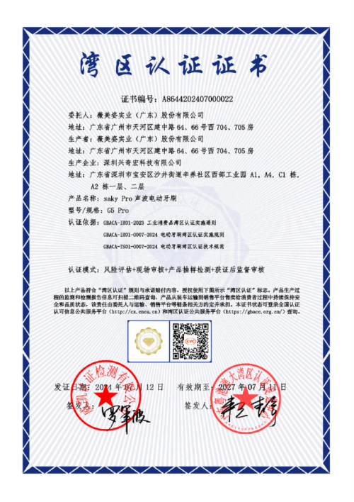 值得一提的是,舒客G5 Pro电动牙刷还通过了GBACA-TS01-0007-2024《电动牙刷湾区认证技术规范》,成为行业首个获得“湾区认证”金标等级的产品。其在清洁效率、长续航、抗菌性能及防水等级等方面均达到高标准,进一步彰显了产品的卓越品质。