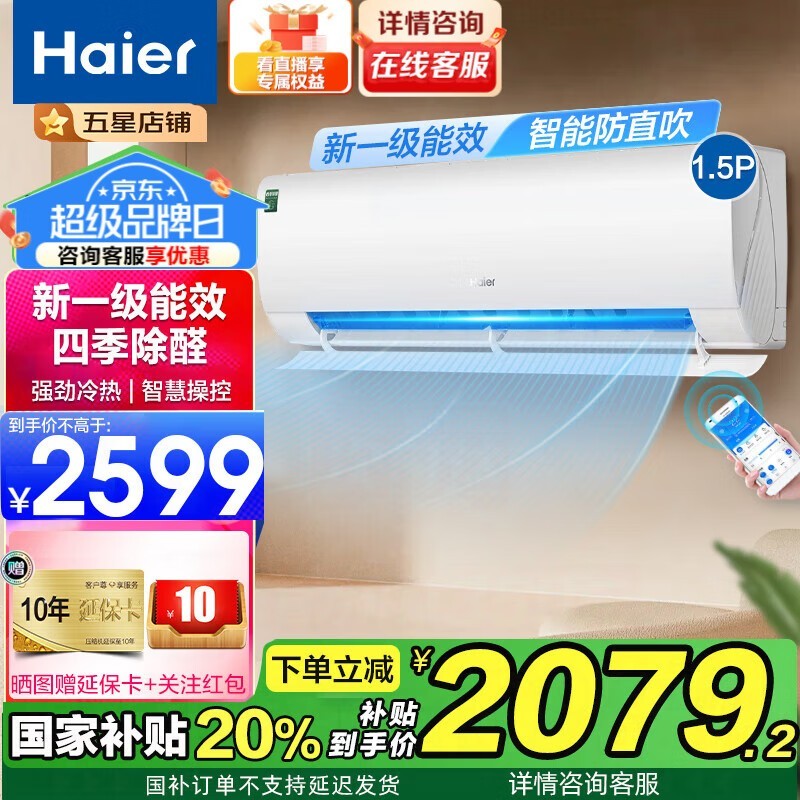 海尔Haier劲爽系列1匹变频省电自清洁空调仅2039元