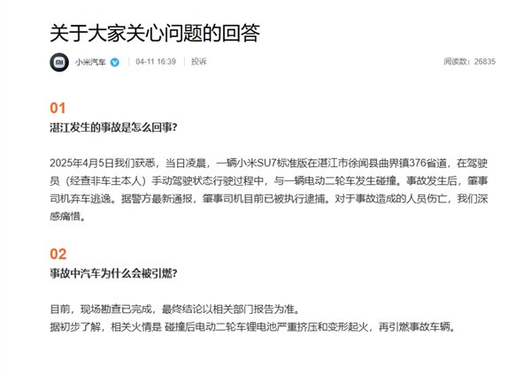 快科技4月11日消息,今天小米汽车发布公告,回应了SU7湛江事故车辆起火的问题。