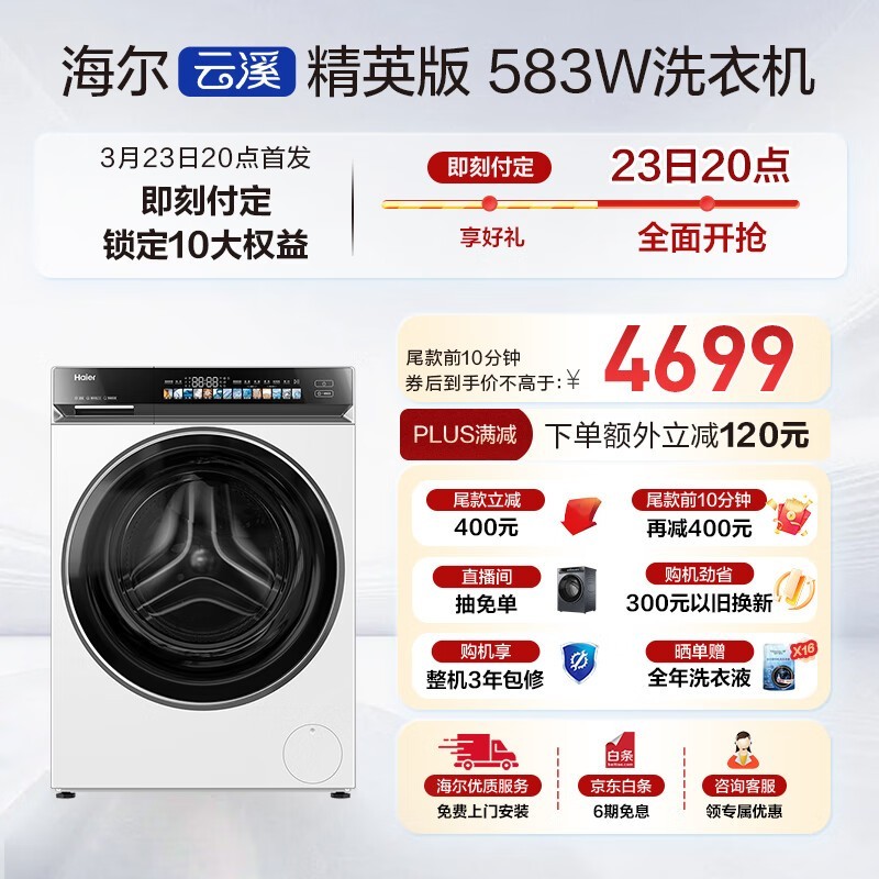 海尔云溪10kg滚筒洗衣机,优惠后3486元