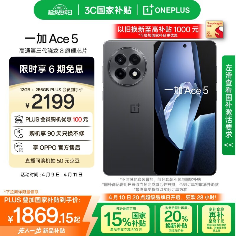 一加Ace 5 5G手机全速黑版京东优惠价低至1869元