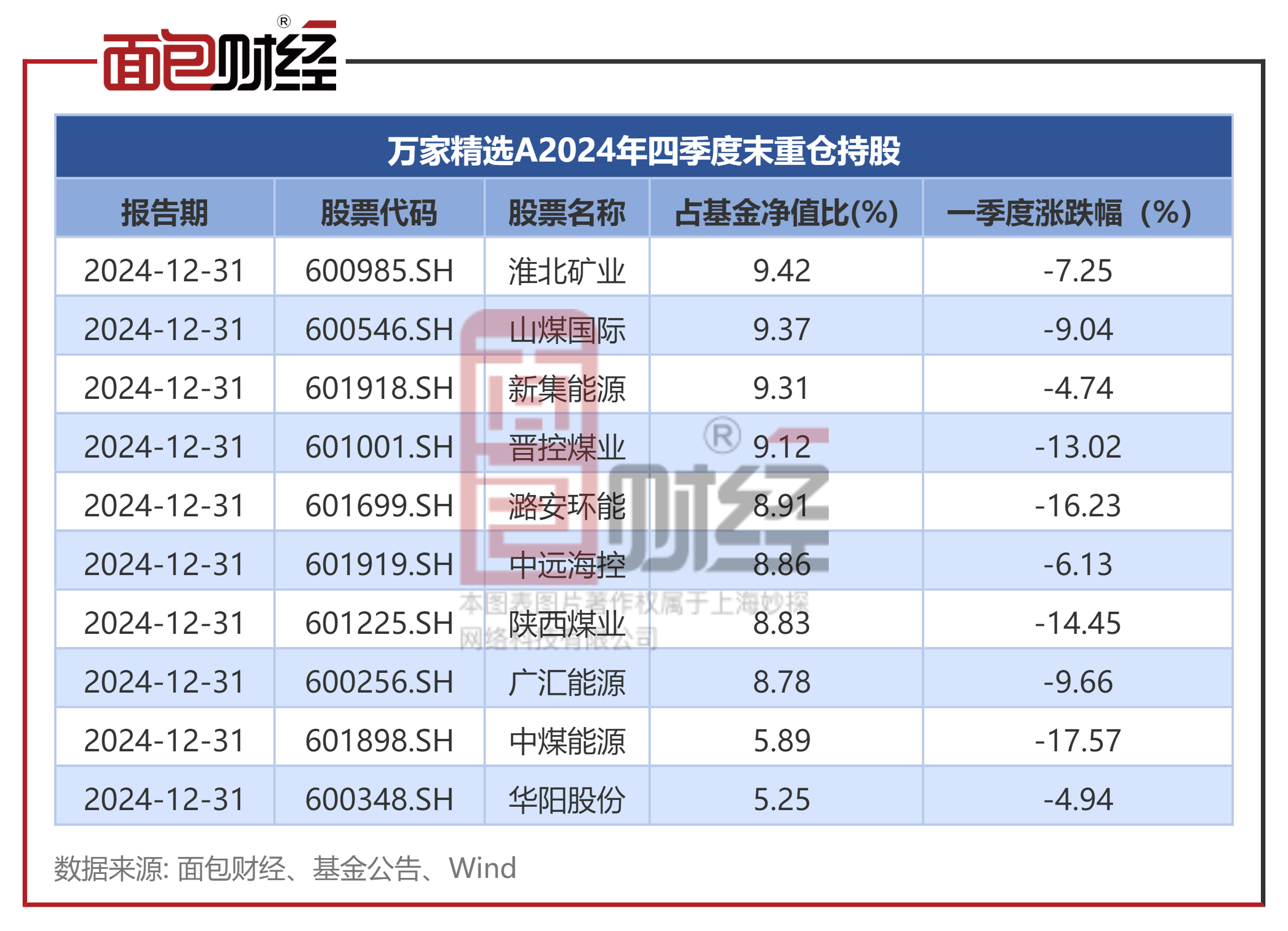 2024年末,基金重仓股主要集中在煤炭板块,包括淮北矿业、山煤国际、新集能源、晋控煤业等。