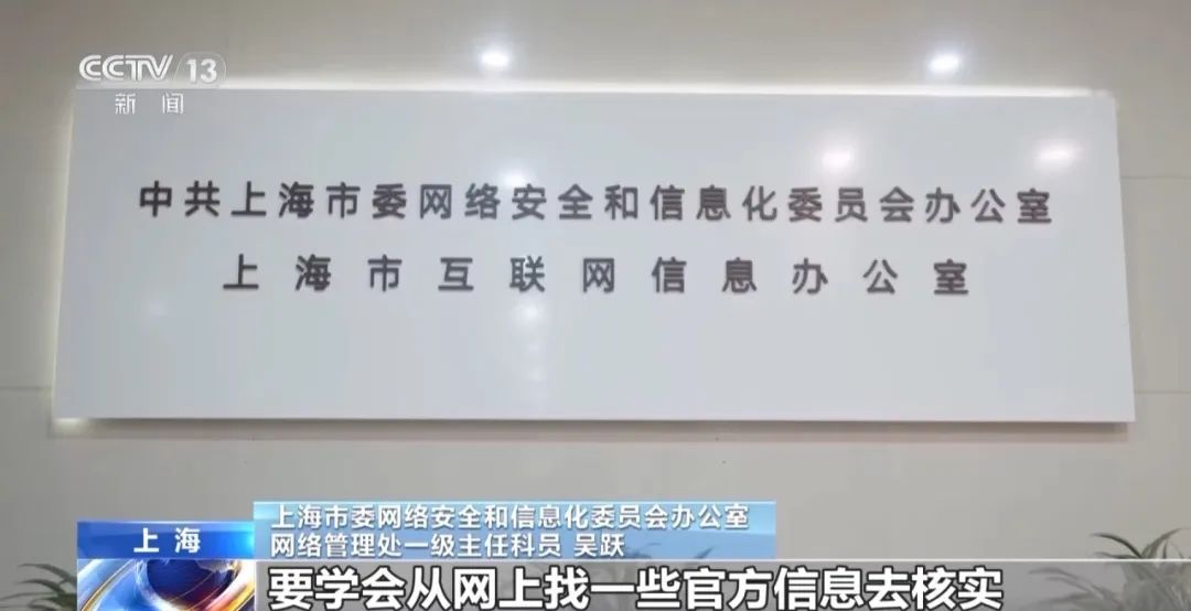 上海市委网络安全和信息化委员会办公室网络管理处一级主任科员 吴跃:网民在看到这些信息时,还是要谨慎分辨这些信息的真伪,要学会从网上找一些官方信息去核实,也要通过一些交叉对比的方式,去验证这些信息的真伪性。尤其是涉及钱财的时候,特别要谨慎,不要轻易去转账、充值等等。