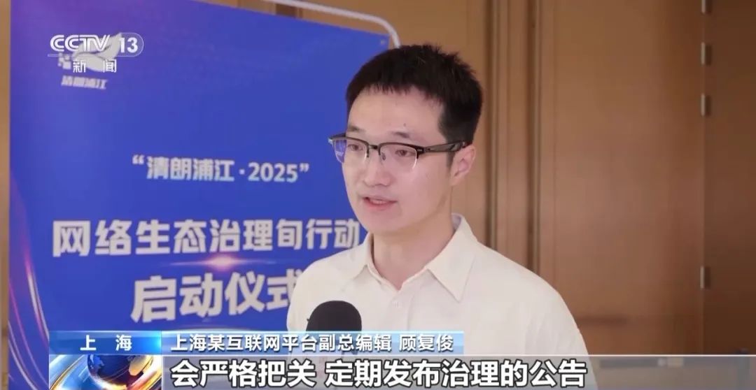 上海某互联网平台副总编辑 顾复俊:我们对账号认证注册信息的复核会严格把关,定期发布治理的公告,治理的内容包括网络暴力、网络谣言、诈骗信息。我们关注未成年人身心健康的方面,进一步完善了未成年人保护模式,用AI、用大模型来进一步辅助我们做好审核工作。