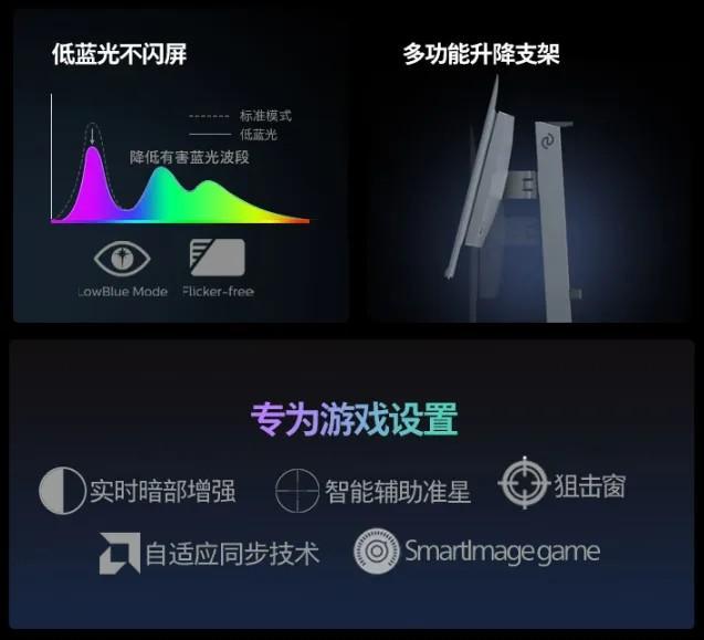 护眼方面,采用软/硬件双重低蓝光技术。硬件低蓝光技术在保持显示亮度不变、画面不偏色的基础上,可以将410-455nm有害短波蓝光与400-500nm普通蓝光的比值控制在50%以下,为大家提供更加舒适的感官体验;配合软件低蓝光技术与全亮度DC调光的不闪屏技术,让其在护眼方面也更胜一筹,即使长时间盯屏畅玩,也能一定程度上缓解眼部疲劳。辅助以调节角度丰富的人体工学底座,使得玩家在各种场景下的游戏舒适性得到最大程度的保障。
