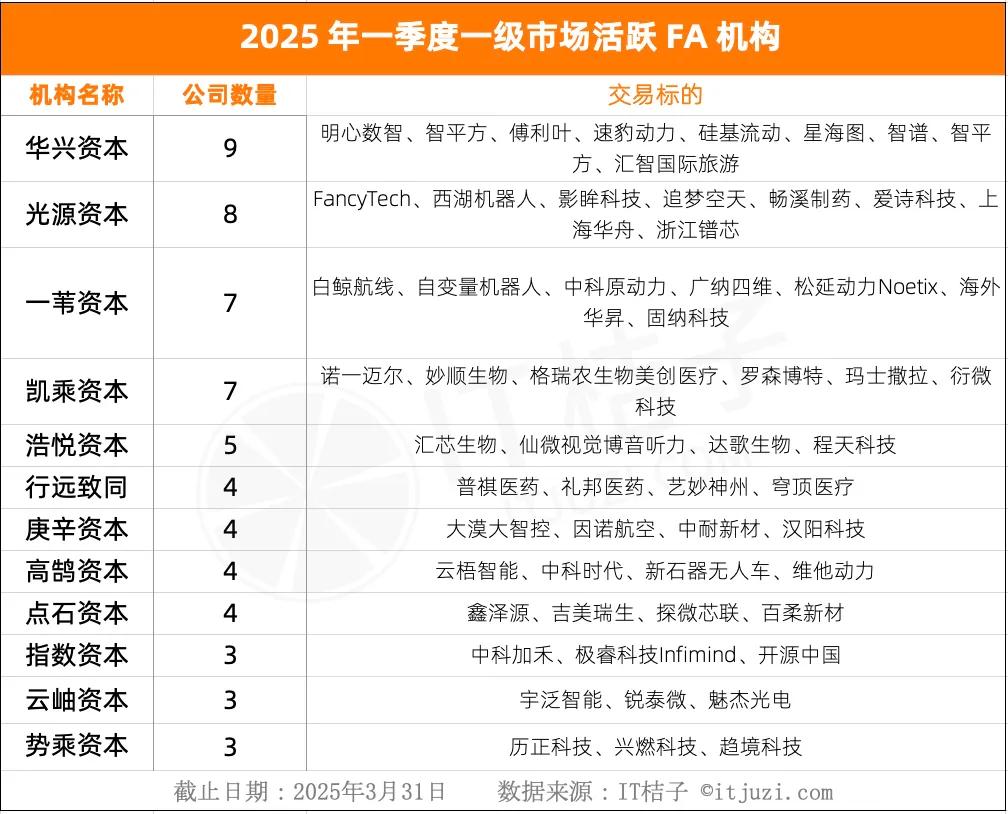 根据 IT桔子数据,2025年 Q1 中国市场活跃的FA机构包括华兴资本、光源资本、一苇资本、凯乘资本、浩悦资本、行远致同等。