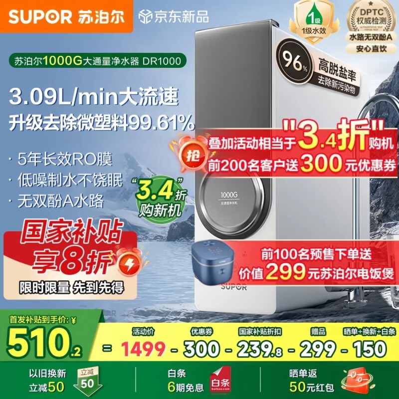苏泊尔SJR-U69反渗透纯水机1000G大流量净水器