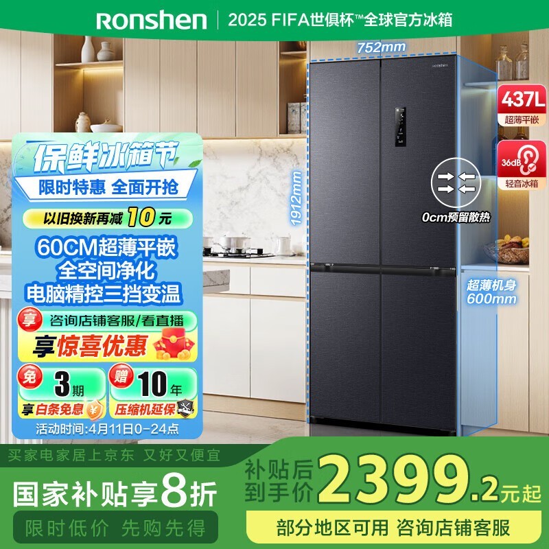 容声437升十字四开门冰箱京东特惠到手2333元